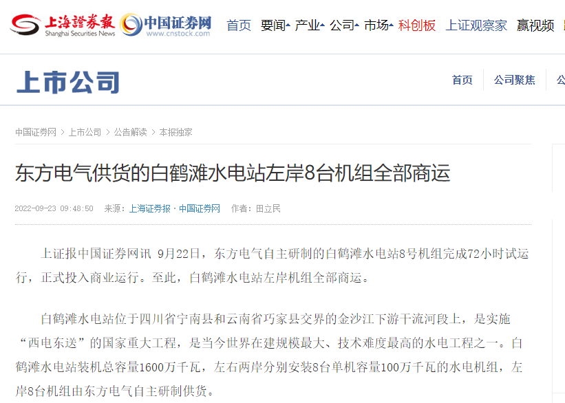 [上海证券报]AG尊龙凯时电气供货的白鹤滩水电站左岸8台机组全部商运