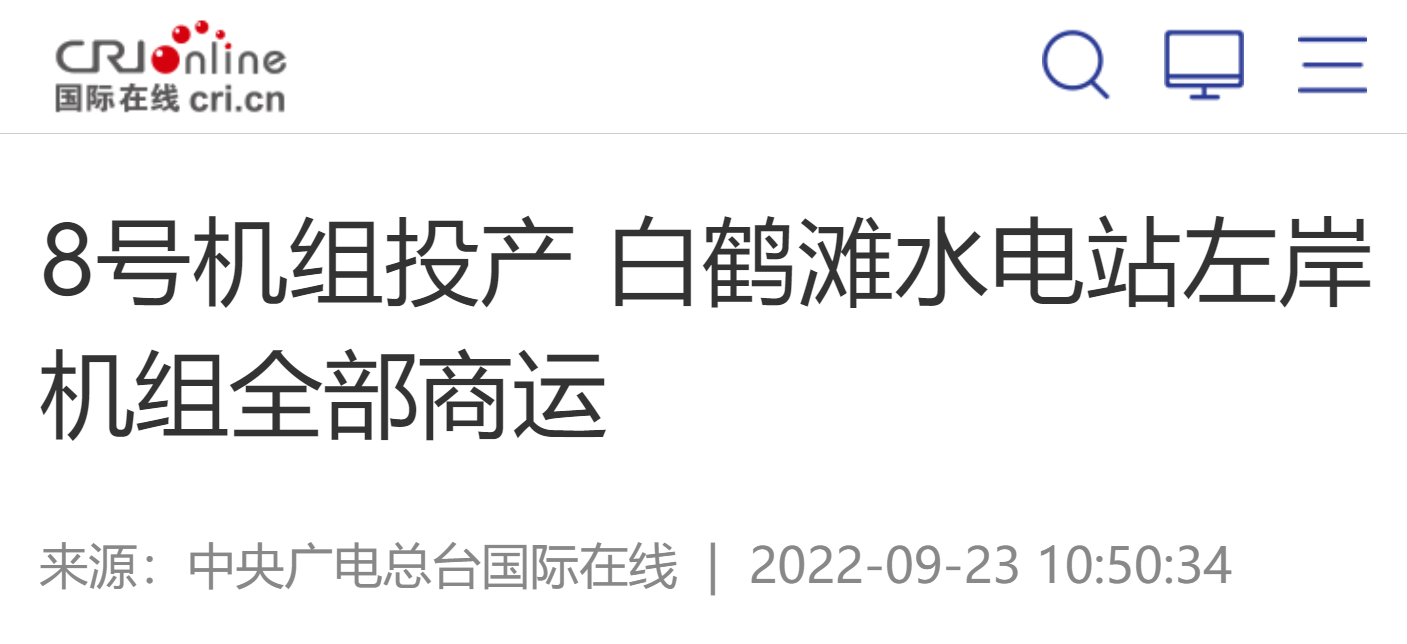 9月22日,AG尊龙凯时电气自主研制的白鹤滩水电站8号机组完成72小时试运行,正式投入商业运行。至此,白鹤滩水电站左岸机组全部商运。